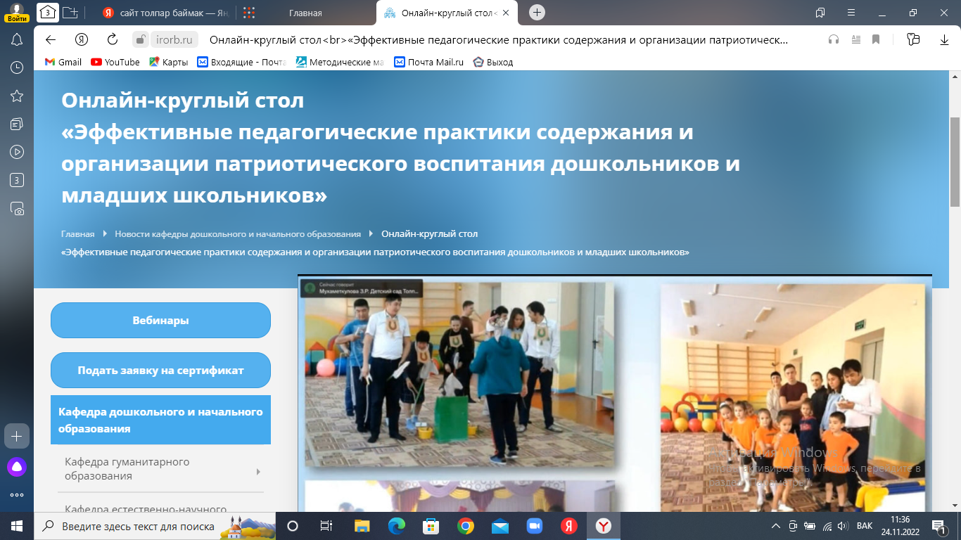 10 ноября 2022 г. состоялся очередной еженедельный онлайн-круглый стол «Эффективные педагогические практики содержания и организации патриотического воспитания дошкольников и младших школьников», который был организован кафедрой дошкольного и начального образования Института развития образования Республики Башкортостан под эгидой Министерства образования и науки Республики Башкортостан.