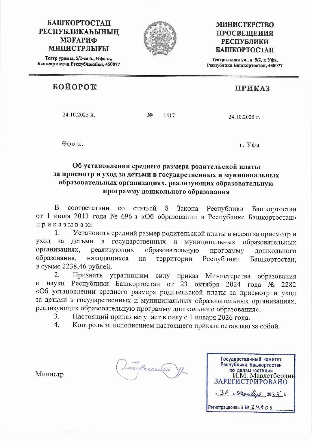 Приказ № 1417 от 24.10.2025 Об установлении среднего размера родительской платы за присмотр и уход за детьми в ДОУ